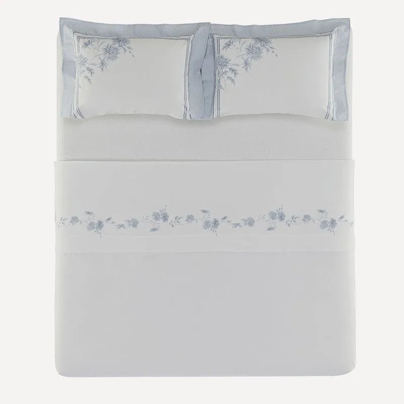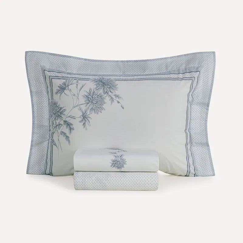 Com estampa floral feita à mão e dimensionada com micropoá, o jogo de cama Mavie se destaca pelos tons de azul sobre fundo branco, que criam sensação plena de leveza e frescor.